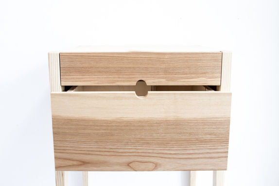 A cabinet with two drawers, to be mounted under a sink. The upper drawer provides space for the sink drain. A niche on the side provides access to electricity sockets.